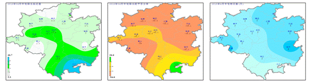 降水量:4月中旬我州各地降水量為2.3~46.7mm(圖2左);與歷年同期相比從江偏多26.6%,其余大部地區(qū)偏少61.7~94.0%(圖2中);旬內(nèi)日降水量≥0.1mm的日數(shù)1~4d(圖2右),有效降水主要集中在11日、15日和19~20日,共有5站出現(xiàn)日降雨量≥10mm的中雨。