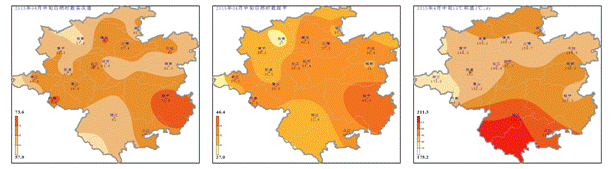 日照、積溫:4月中旬日照時(shí)數(shù)57.9~73.6h (圖3左),與歷年同期相比偏多27.0~46.4h (圖3中);旬內(nèi)逐日平均氣溫均高于10℃,其中15~19日各地日平均氣溫均高于20℃,≥10℃的活動(dòng)積溫為175.2~211.3℃·d (圖3右)。