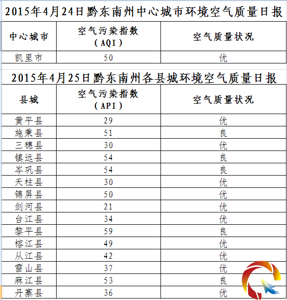 2015年4月25日黔東南州各縣(市)環(huán)境空氣質(zhì)量日?qǐng)?bào)