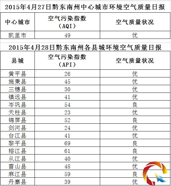 2015年4月28日黔東南州各縣(市)環境空氣質量日報