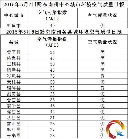 2015年5月8日黔東南州各縣(市)環境空氣質量日報