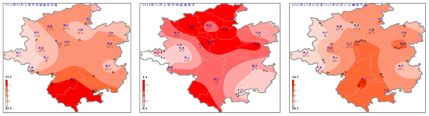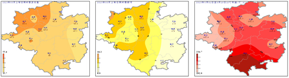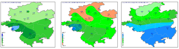 日照、積溫:5月上旬日照時(shí)數(shù)35.7~55.4h (圖3左),與歷年同期相比偏多0.9~16.2h (圖3中);旬內(nèi)逐日平均氣溫均高于15℃,≥10℃的活動(dòng)積溫為192.9~231.7℃·d (圖3右),熱量條件較好。