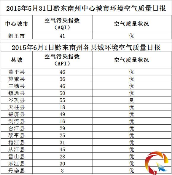 2015年6月1日黔東南州各縣(市)環(huán)境空氣質(zhì)量日?qǐng)?bào)