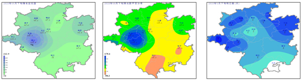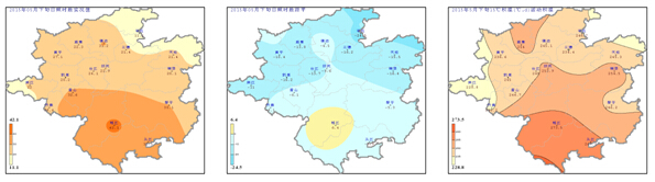 日照、積溫:5月下旬日照時數11.1~42.1h (圖3左),與歷年同期相比偏少4.5~24.5h (圖3中);≥15℃的活動積溫為228.8~273.5℃·d (圖3右),旬內大部地區日平均氣溫在20℃以上,喜溫作物正常生長所需熱量條件好。