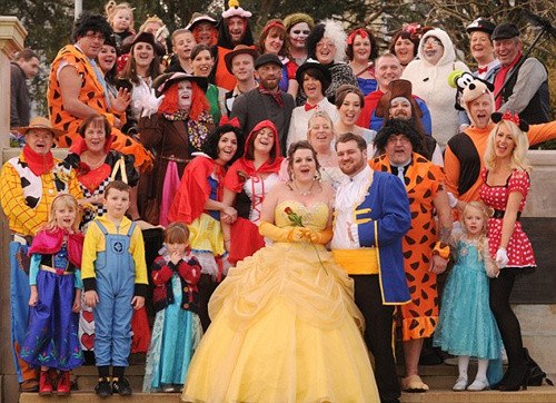 這場別開生面的婚禮邀請了不少迪士尼動畫中的知名人物。除了打扮成高飛、米老鼠以及動畫《歡樂滿人間》中仙女們的親友參加了婚禮外,這對新人的父母也以《101忠狗》中的壞女子庫伊拉及《摩登原始人》中弗雷迪的形象出現。