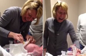 孩子的祖母趕來幫新生兒換尿布,沒想到一將尿布掀開那表情完全一陣驚訝,嘴巴張得老大,完全不敢相信眼前的事實,還將尿布掀了又掀來回檢查,場面令人忍俊不禁。