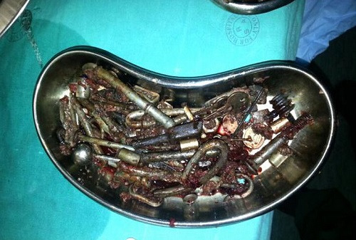 該名25歲男子由于沒(méi)未按時(shí)服用精神類(lèi)藥物,吞食叉子、鑰匙、螺栓、1蘭特硬幣以及其他金屬物件共227個(gè)。