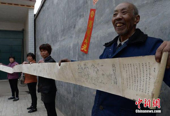 3月25日,河北省邢臺市,71歲的陳書奇和村民一起展示自己手繪的《農(nóng)村生活圖》。據(jù)悉,河北省隆堯縣東良鄉(xiāng)陳莊村71歲的陳書奇老人,以自己居住的村莊和生活為樣本,耗時近40年,手繪約70米長的《農(nóng)村生活圖》。這幅黑白相間的圖畫圖文并茂,記錄了從1945年至今70年的農(nóng)村生產(chǎn)生活巨變,以及風俗歷史的演變。驢拉磨、牛耕田、轆轤澆地……一些早期農(nóng)村生產(chǎn)生活的場景活靈活現(xiàn),打鐵、補鍋、編席、木弓彈棉花 等,一些如今難以見到的傳統(tǒng)手工藝制作流程也躍然紙上。黃濤 攝 圖片來源:CFP視覺中國