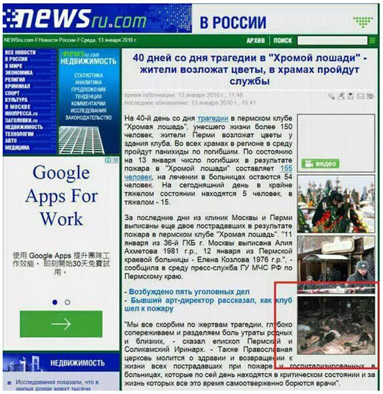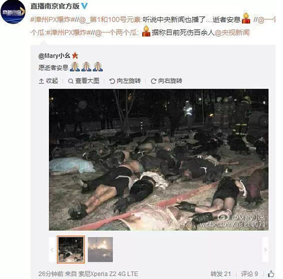 根據(jù)國家互聯(lián)網(wǎng)信息辦公室違法和不良信息舉報中心轉(zhuǎn)來的網(wǎng)民舉報線索,4月6日18時56分,漳州古雷PX化工項目(漳州古雷騰龍芳烴公司二甲苯塔加熱爐)漏油著火事故發(fā)生后,張某于20時12分用手機上網(wǎng),通過QQ網(wǎng)名“小故事”、微博賬號“@Mary小幺”等互聯(lián)網(wǎng)賬號分別在騰訊QQ群、新浪微博等互聯(lián)網(wǎng)上散布“漳州古雷PX化工項目發(fā)生爆炸起火死人”的謠言,并附有虛假現(xiàn)場死傷照片(經(jīng)查,系2009年俄羅斯彼爾姆邊疆區(qū)首府彼爾姆市一家名為“瘸腿馬”的夜總會煙花爆炸事故照片,如圖所示)。