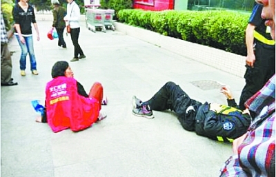 “城管和發(fā)廣告的大媽干仗了,雙雙倒地不起,城管執(zhí)法到底應該怎么做?”昨天,武漢創(chuàng)客餐飲管理有限公司總經(jīng)理助理陳先生發(fā)了條微博,微博的照片中,一位城管隊員和發(fā)廣告的大媽躺在地上,表情痛苦。