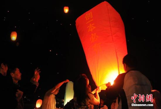 6月4日,趕考前夜,毛坦廠中學(xué)的學(xué)生們?cè)诳酌鳠羯蠈?xiě)下心愿,向天空放飛希望,萬(wàn)只孔明燈映紅了小鎮(zhèn)上空。當(dāng)日,安徽省六安市毛坦廠鎮(zhèn)毛坦廠中學(xué)即將迎來(lái)2015年度高考。趕考前夜,高三學(xué)生與陪讀家長(zhǎng)在學(xué)校周邊的空地上放飛孔明燈,預(yù)祝高考金榜題名。 中新社發(fā) 韓蘇原 攝