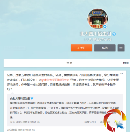 隨后,清華大學四川招生組官方微博轉發并評論北大招生組的微博,職責對方對報考清華的考生“許以重金”。