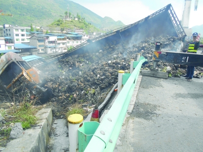 13時30分左右,桐梓縣消防中隊趕到現(xiàn)場,經(jīng)過30多分鐘撲救,貨車外部的明火被撲滅,但貨物內(nèi)部仍存在很多隱形的燃點,消防戰(zhàn)士利用火鉤、鐵鍬等工具清理貨車上的貨物,配合水槍撲救,1個多小時后,燃點逐一撲滅。