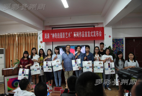 5月30日,貴州省都勻市擅長(zhǎng)捕捉光影的另類攝影人周濤,近期編集出版的"神奇的攝影藝術(shù)"系列作品(包括《印象攝影》、《光影攝影》、《圖案攝影》、《裝飾攝影》)首發(fā)式發(fā)布會(huì)暨捐贈(zèng)活動(dòng)在貴陽舉行,來自貴州美術(shù)院校的部分學(xué)生代表、40余家新聞媒體及省內(nèi)部分?jǐn)z影家代表共70余人參加。