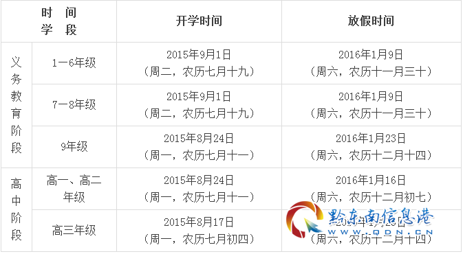 根據《義務教育課程設置實驗方案》、《普通高中課程方案(實驗)》、《省教育廳關于下達義務教育課程計劃(修訂)的通知》(黔教基發〔2009〕62號)、《省教育廳辦公室關于印發<貴州省普通高中課程改革實驗課程安排與管理指導意見(試行)>等普通高中課程改革實驗配套實施意見的通知》(黔教辦基〔2010〕137號)和《省教育廳關于堅決規范中小學辦學行為切實減輕學生過重課業負擔全面提高教育教學質量的意見》(黔教基發〔2011〕85號)等文件精神,結合我省中小學實際,現將我省中小學2015-2016學年度開學及放假時間印發給你們,請遵照執行。