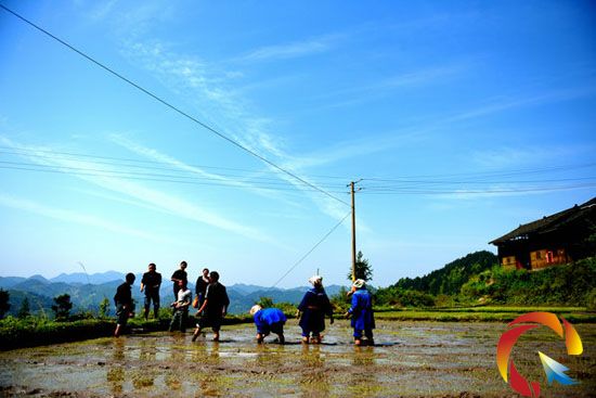 正在插秧的報京侗族群眾,愉快地唱著歌(李安生 攝)