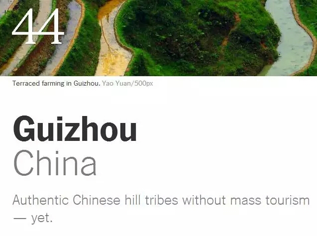1月7日出版的《紐約時報》公布了2016年世界上52個最值得到訪的旅游目的地(即“必到旅游勝地推薦”),中國僅有貴州和杭州上榜�!都~約時報》給貴州的推薦理由是“Authentic Chinese hill tribes without mass tourism — yet.”(正宗的中國山地部落,還沒有大眾旅游)。