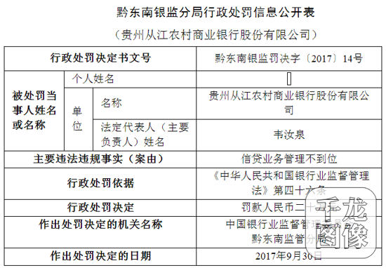 文件顯示,貴州從江農村商業銀行股份有限公司,法定代表人(主要負責人)姓名韋汝泉,因信貸業務管理不到位,依據《中華人民共和國銀行業監督管理法》第四十六條,黔東南監管分局對其作出罰款20萬元的行政處罰。