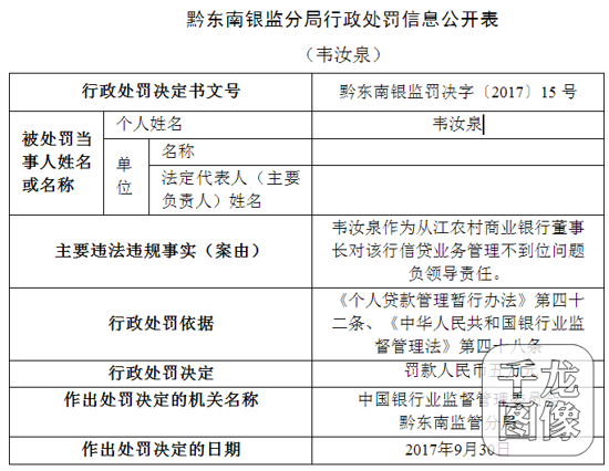 同時,韋汝泉,作為從江農村商業銀行董事長對上述違法行為負領導責任,依據《個人貸款管理暫行辦法》第四十二條、《中華人民共和國銀行業監督管理法》第四十八條,黔東南監管分局決定對韋汝泉作出罰款5萬元的行政處罰。