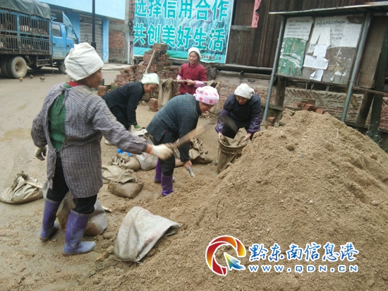 圖為翠里鄉(xiāng)高武村中年婦女正忙著搬運(yùn)沙子