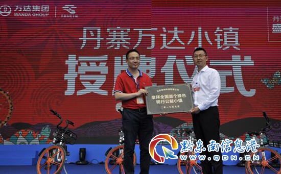 北京摩拜科技有限公司向丹寨萬(wàn)達(dá)小鎮(zhèn)代表授予“摩拜全國(guó)首個(gè)綠色騎行公益小鎮(zhèn)”稱號(hào)