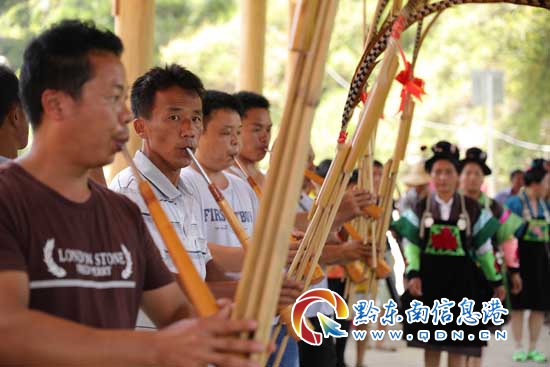苗族村民在吹奏蘆笙慶賀新風雨橋落成