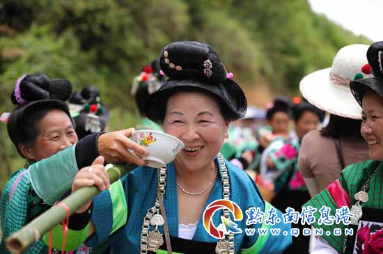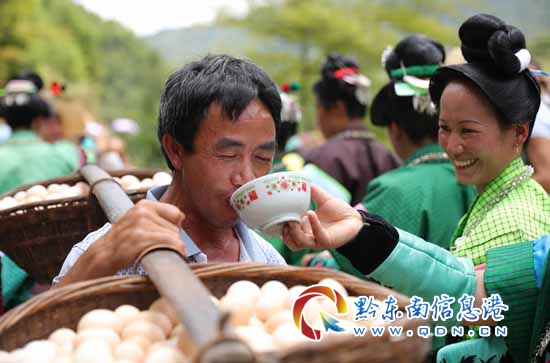 苗族村民向前來慶賀的姑父敬酒