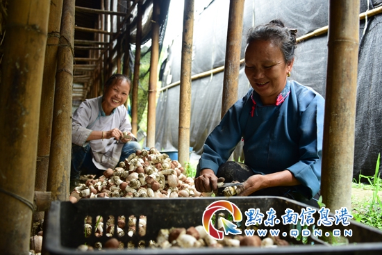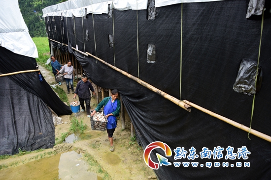 本網訊 9月6日,丹寨縣排調鎮也改村遠景自然寨的30余畝姬松茸迎來采摘期。據了解,該村以“企業+合作社+貧困戶”模式投建的16個姬松茸種植大棚總面積30余畝,每棚每批可產1200余斤,每棚年產10至12批,按每斤4元的“訂單”價全部收購,今年預計為該村60戶貧困戶和務工農戶增收80余萬元。