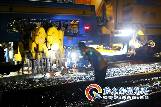 5月24日凌晨,在貴州省境內寶老山火車站,一名職工在大型搗固機車旁觀察機械搗固鋼軌作業。