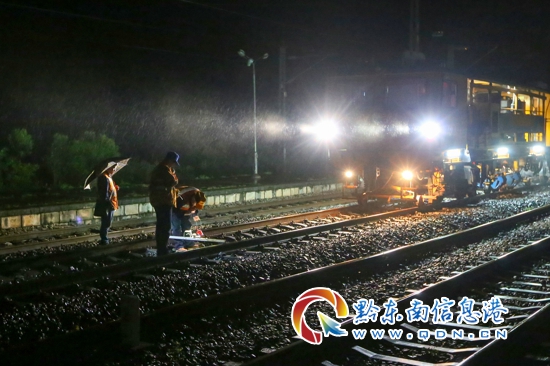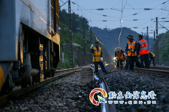 5月24日凌晨,在貴州省境內寶老山火車站,鐵路職工在整治固鋼軌線路。