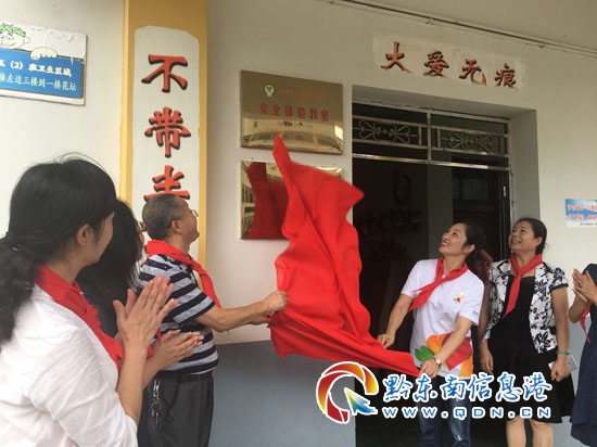 在現場嘉賓、老師、同學們的見證下,貴州省婦女兒童發展基金會安紅理事長、愛心企業代表陳欣欣、黔東南州婦聯主席陳曉瓊將安全體驗教室牌與安全體驗教室鑰匙模型遞交給學校王關付校長。