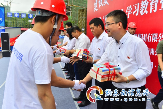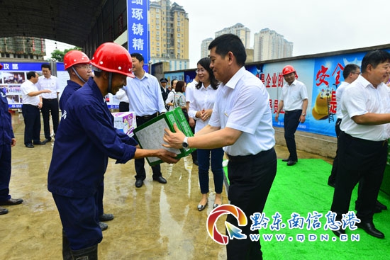 會議活動還對相關單位授“黨員突擊隊旗”、“工人先鋒號旗”和“青年突擊隊旗”,并頒發了“幸福項目部”獎牌和標準化工地獎牌,為員工代表和農民工代表贈送了黨的建設、企業文化書籍,對項目困難農民工進行了看望慰問。動員會結束后,參會領導還參觀了凱里“未來城”城市之門大酒店精細化管理項目現場。
