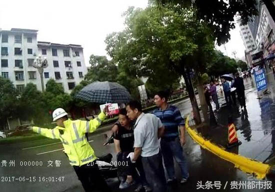 當天16時10分左右,凱里市公安局交警大隊城區一中隊輔警王維正在萬博路段執勤,突然看到兩名工人急急忙忙地抬著一名滿臉鮮血的男子從巷子里沖出來,并大聲的向他求助,王維立即上前詢問,為傷者打傘遮雨,并攔停了一輛出租車。
