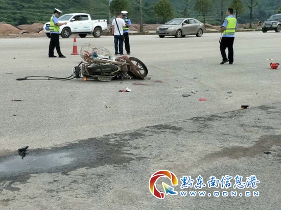 據了解,24日上午10時15分許,在凱里高速南站路口一輛從凱里舟溪方向往鴨塘街道方向行駛的轎車,與一輛從鴨塘街道往舟溪方向行駛的二輪摩托車相撞,摩托車翻倒在地,造成摩托車駕駛員和乘車人員不同程度的負傷,無人員死亡。事故中,二輪摩托和轎車都受到不同程度損壞;目前,事故原因交警部門事正在調查中。
