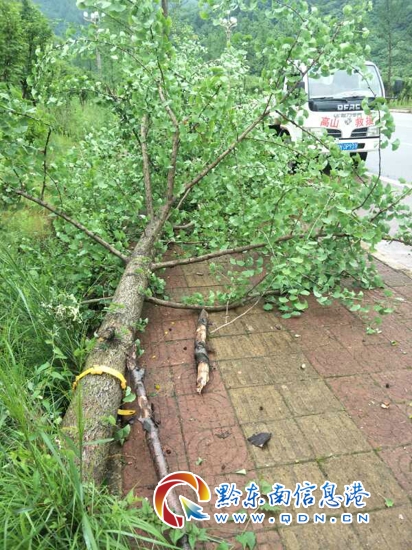 本網訊 (實習記者 田應龍 攝影報道) 6月25日上午,雨天路滑,在凱里市濱河路(濱江山莊東北)處,由于車速過快拐彎時導致車輛側翻,撞斷路邊剛種的白楊樹。
