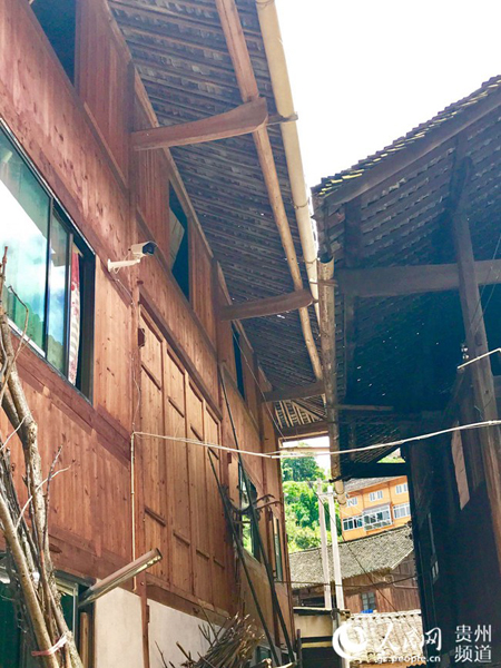 7月7日,行走這苗寨吊腳樓巷子,突然,抬頭看見,咖啡色板壁,鋁合金窗一旁卻“長”了一只電子眼,質疑不解。