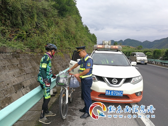 本網訊 9月10日15時許,凱里路政執法路政員在巡查至滬昆高速凱麻段K1710上行處時,發現一人騎著自行車在高速路上前行,路政員立即叫停自行車,并了解有關情況。