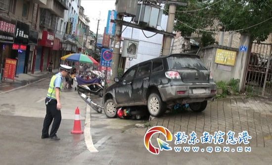 當日上午8時46分,在黎平縣城區府前路,有一輛黑色的越野車撞到了路邊的一根電線桿,越野車下面,還壓有一輛黑色的摩托車,所幸事故沒有造人員傷亡,但讓民警驚出一身冷汗的是,被撞的電線桿一旦斷裂,后果不堪設想。 該車駕駛員吳某在現場告訴民警稱,因事故發生的地點是一個陡坡,事故發生的原因是他正在上坡要調頭回來時,往上倒車,沒相想到倒完車再換前進檔下坡時車輛剎車突然失靈,而導致的車輛沖下道路外坎,發現剎車失靈后,駕駛員瞬間拉起手剎,減輕車輛撞擊力,電線桿沒有斷裂,只是兩車不同程度受損。