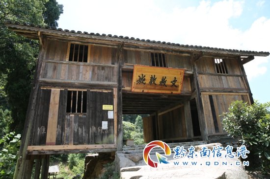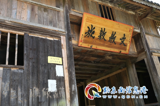 據黎平縣文物局局長楊祖華介紹,這座清朝嘉慶年間的兩層四間的木質結構的私塾學校始建年代《黎平府志》有記載,私塾學校大門掛的“文教敷施”的牌匾的一排小字記載是嘉慶二十三年孟冬等字樣,至今保存完好。經考證距今199年。