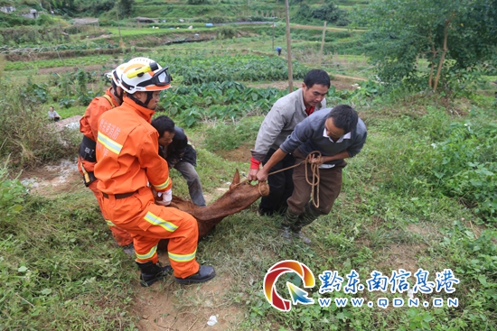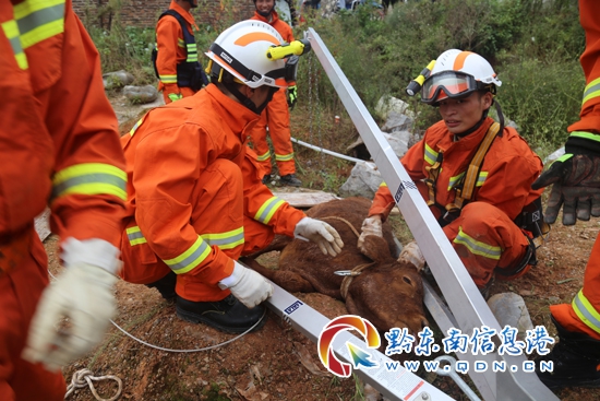 本網訊 10月5日10時14分,黎平大隊接到群眾求助,位于黎平縣德鳳鎮雙鳳社區,有2頭黃牛不慎掉進正在施工的一口地基井里,接到報警電話后,黎平大隊迅速出動1個搶險救援編隊2車7人趕往現場。