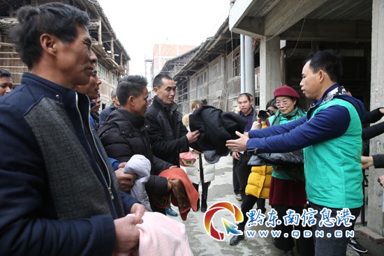 圖為青鳥助學黎平分會的愛心人士將過冬的羽絨服送到受災群眾手中的情形