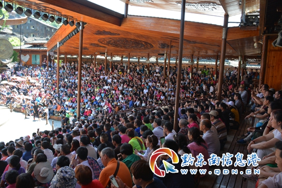 為了讓游客高興而來,滿意而歸,旅游部門、公安民警、交警、景區工作員認真做好接待工作,堅守工作崗位,維護社會秩序,保障道路交通安全暢通。由于措施得力,接待有序,使該縣旅游情況良好,無任何游客投訴案件和旅游安全事故發生。圖為表演現場均為西江千戶苗寨。(張希才 攝影報道)