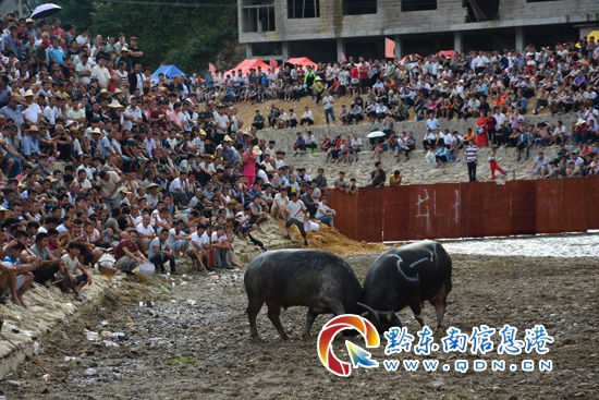 本網(wǎng)訊 2017年7月3日(農(nóng)歷六月初十)“卯日”是雷山縣一年一度民族傳統(tǒng)節(jié)日——“吃新節(jié)”。為了讓廣大人民群眾度過(guò)一個(gè)歡樂(lè)祥和的節(jié)日,展示多資多彩的苗族傳統(tǒng)斗牛文化,增強(qiáng)民族團(tuán)結(jié),振奮民族精神,推動(dòng)旅游業(yè)和地方經(jīng)濟(jì)的發(fā)展。節(jié)前,丹江鎮(zhèn)陶?qǐng)蚱瑓^(qū)的陶?qǐng)颉⒏绅ā⒒㈥?yáng)三村寨聯(lián)合籌措資金,于7月5日,舉辦了B組、C組兩個(gè)別“牛王”爭(zhēng)霸賽。來(lái)自雷山縣的丹江、郎德、大塘、西江等地的33頭斗牛參與角逐。