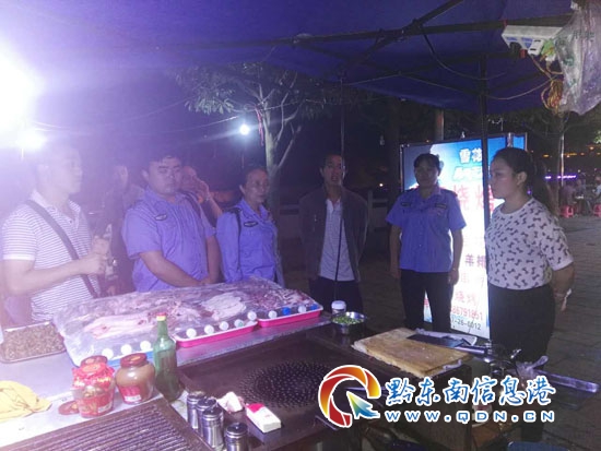 本網訊 近日,雷山縣丹江花園河濱道夜市燒烤攤較多,占道經營現象、噪音、油煙污染給周圍住戶帶來極大困擾。為維護縣城市容環境,9月20日晚,縣市政局聯合縣環保局、縣市場監督管理局多家部門對丹江花園河濱道夜市燒烤攤進行聯合整治。