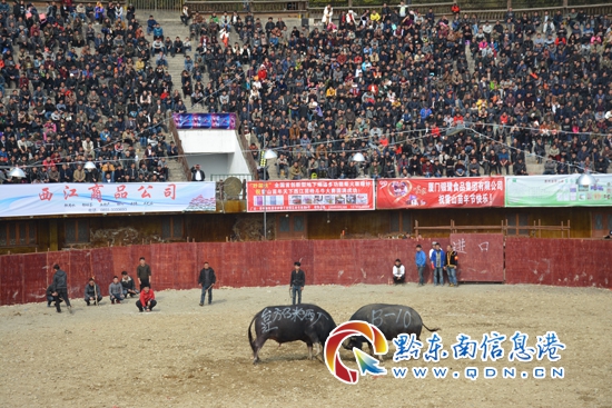 來自身價50萬元的雷山縣西江鎮貓鼻嶺村文老四的“西江一號”31號“牛王”表現突出,當天打敗了8頭對手。最后決賽,文老四的“西江一號”牛王與臺江縣唐先奎的11號“碰牛”爭奪冠軍,經過4分28秒的激烈爭奪,“西江一號”牛王勇奪冠軍,臺江11號“碰牛”敗北,獲得亞軍,來自雷山西江鎮白堯寨潘家海的29號斗牛獲得季軍,分別撬走了10萬元、6萬元、3萬元的獎金;來自雷山縣郎德鎮烏流村的15號斗牛,丹寨縣文鳳偉的16號斗牛,劍河縣都小勇的28號斗牛,貴陽“財神”拖皮的33號斗牛,云南“小鐵牛”錢老三的6號斗牛,分別獲得四、五、六、七、八名次,獎金則分別獲得1萬元、0.6萬元、0.5萬元、0.4萬元、0.3萬元。(張希才攝影報道)