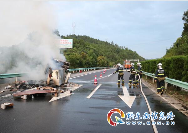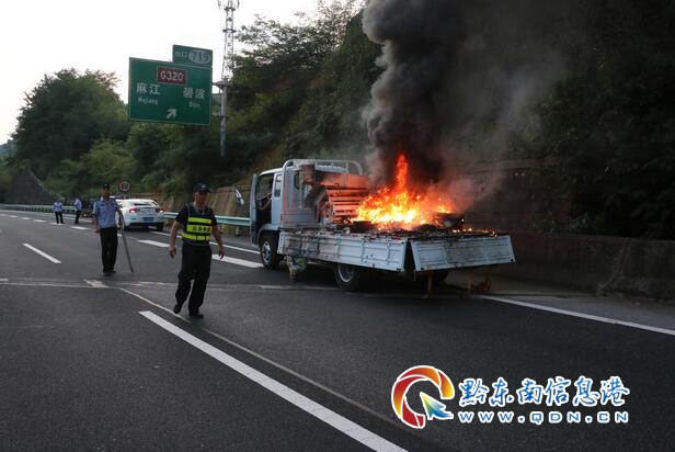 19時34分,消防官兵到場后,發現一輛滿載電瓶的小型貨車正冒著熊熊烈火緩慢行駛,電瓶散落一地,為防止爆炸危險事故發生,駕駛員將處于燃燒中的太陽能發電機卸到路旁,并在路政人員的指引事故車輛靠邊停車。了解情況后,警戒組配合高速交警對該事故現場進行交通管制,并出兩支水槍對車輛和地上的發電機進撲救,10分鐘后,明火被成功撲滅,為防止復燃情況發生,消防官兵再次對事故車輛進行徹底的檢查,確認安全后,便將現場轉交交警部門。