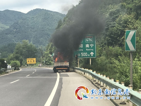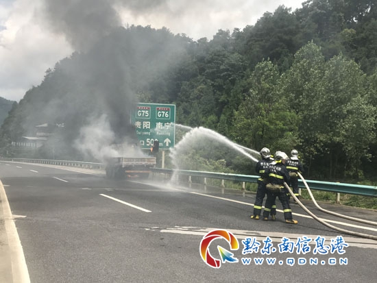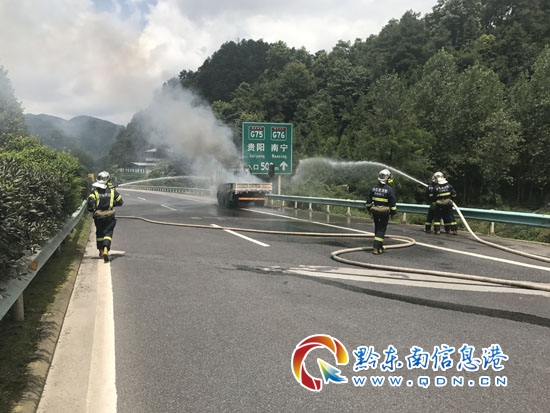 本網訊 7月15日11時30分,麻江消防接到報警稱,麻江往貴陽高速路夾巖河路段一輛貨車發生自燃,情況危急。接到報警后,麻江消防立即出動2車12名官兵趕赴現場救援。