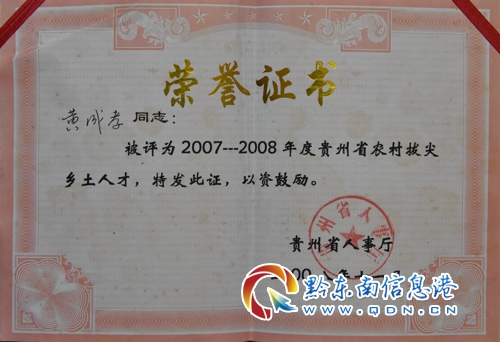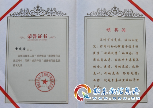 一份耕耘,一分收獲。黃成孝獲得了上級的各種表彰。2006年,他榮獲黔東南州“優(yōu)秀鄉(xiāng)村醫(yī)生”稱號;2008年,他被授予鎮(zhèn)遠縣“勞動模范”稱號;2008年,他獲得2007-2008年度“貴州省農(nóng)村拔尖鄉(xiāng)土人才”稱號……2014年,他榮獲鎮(zhèn)遠縣第二季“感動鎮(zhèn)遠”、“誠實守信、道德模范”提名獎。在各種榮譽面前,他并沒有忘記初心,仍然一如既往地工作。