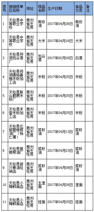 2017年5月5日,黔東南州食品藥品監(jiān)督管理局官網(wǎng)發(fā)布2017年第7期州級食品安全監(jiān)督抽檢公告稱,近期,州食品藥品監(jiān)督管理局組織開展了對生產(chǎn)環(huán)節(jié)小作坊、餐飲環(huán)節(jié)食品監(jiān)督抽檢工作,共計抽取白酒(含米酒)、米粉、食用油、大米、煎炸油、面制品等6類11個批次樣品。經(jīng)黔東南州食品藥品檢驗檢測中心檢驗,11批次食品全部合格,合格率100%。