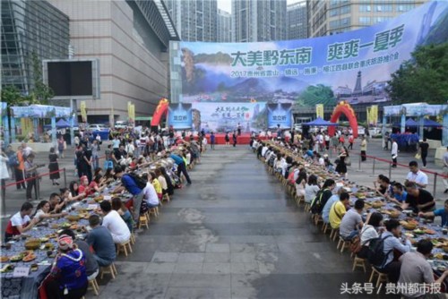 “都說重慶的夜景驚艷全國,可這下子大美黔東南的長桌宴驚艷重慶嗦!” 6月11日,貴州省黔東南州的雷山、鎮遠、施秉、榕江四個縣聯合到重慶解放碑廣場舉行旅游推介會,并將特有的長桌宴搬到了重慶國際會議展覽中心茶博會現場,市民王女士看到壯觀場面后驚嘆道。